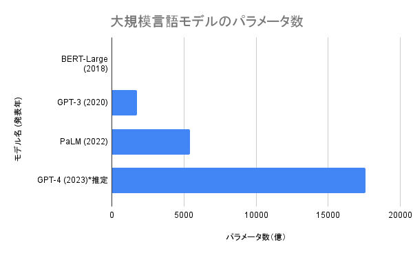 2018年に登場したBERT-Largeのパラメータ数は約3億4000万でした。しかし、そのわずか2年後の2020年に登場したGPT-3は、その約500倍にあたる1750億個。そして、2022年以降に登場したモデルの中には、1兆を超えるパラメータ数を持つものも存在すると言われています。
