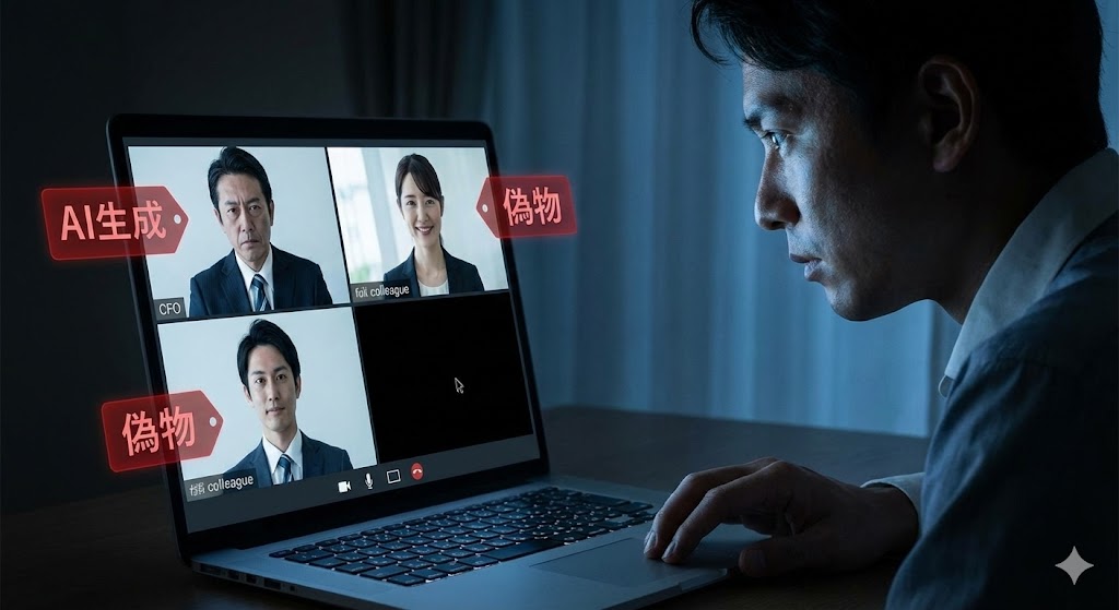 情報の「入力(漏洩)」だけでなく、AIによって生成されたコンテンツによる「騙し」も、最新のセキュリティリスクです。特に「ディープフェイク(AIによる偽動画・偽音声)」の技術は、もはや人間の目や耳では見抜けないレベルに達しています。